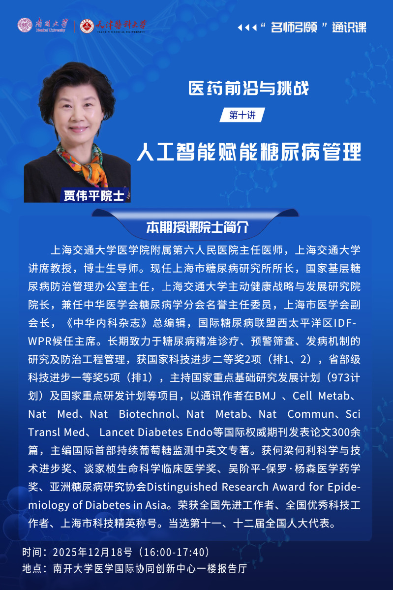 课程预告 || 贾伟平院士:人工智能赋能糖尿病管理名师引领通识课“医药前沿与挑战”第五季第十讲:人工智能赋能糖尿病管理讲座时间12月18日周四第九、十节(16:00—17:40)讲座地点南开大学医学国际协同创新中心一楼报告厅2025-12-17