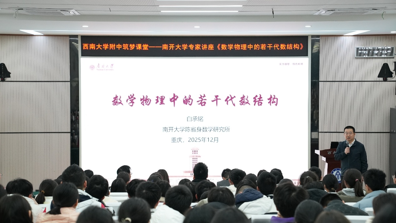 活动中,白承铭一行前往重庆市育才中学校和西南大学附属中学校开展招生宣讲和座谈交流。在两所中学,白承铭为400余名高二高三年级学生作“数学物理中的若干代数结构”科普讲座。他从对称性与群、李群与李代数和Hopf代数与量子群三方面开展数学科普,并耐心回答现场同学提问,点燃学生对数学学科的探索兴趣,帮助中学生建立科学的认知框架。讲座后,白承铭和招生负责人分别向学生们介绍了数学学科和陈省身数学研究所的发展历程、学科资源和杰出校友,以及南开大学历史沿革、办学优势、学科发展、创新前沿等情况,并着重介绍了“两个百分百,四个全放开”等招生培养政策,欢迎中学生报考南开大学。