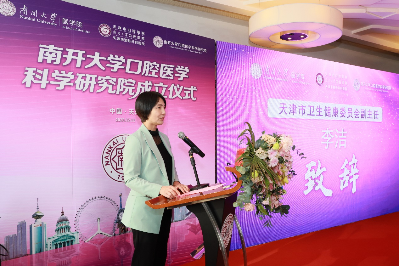 在致辞环节,李洁副主任代表天津市卫健委对研究院的成立表示热烈祝贺。她指出,研究院的设立是推动天津口腔医学高质量发展的重要举措,希望其立足区域需求、服务国家战略,成为医教融合、产研协同的典范。