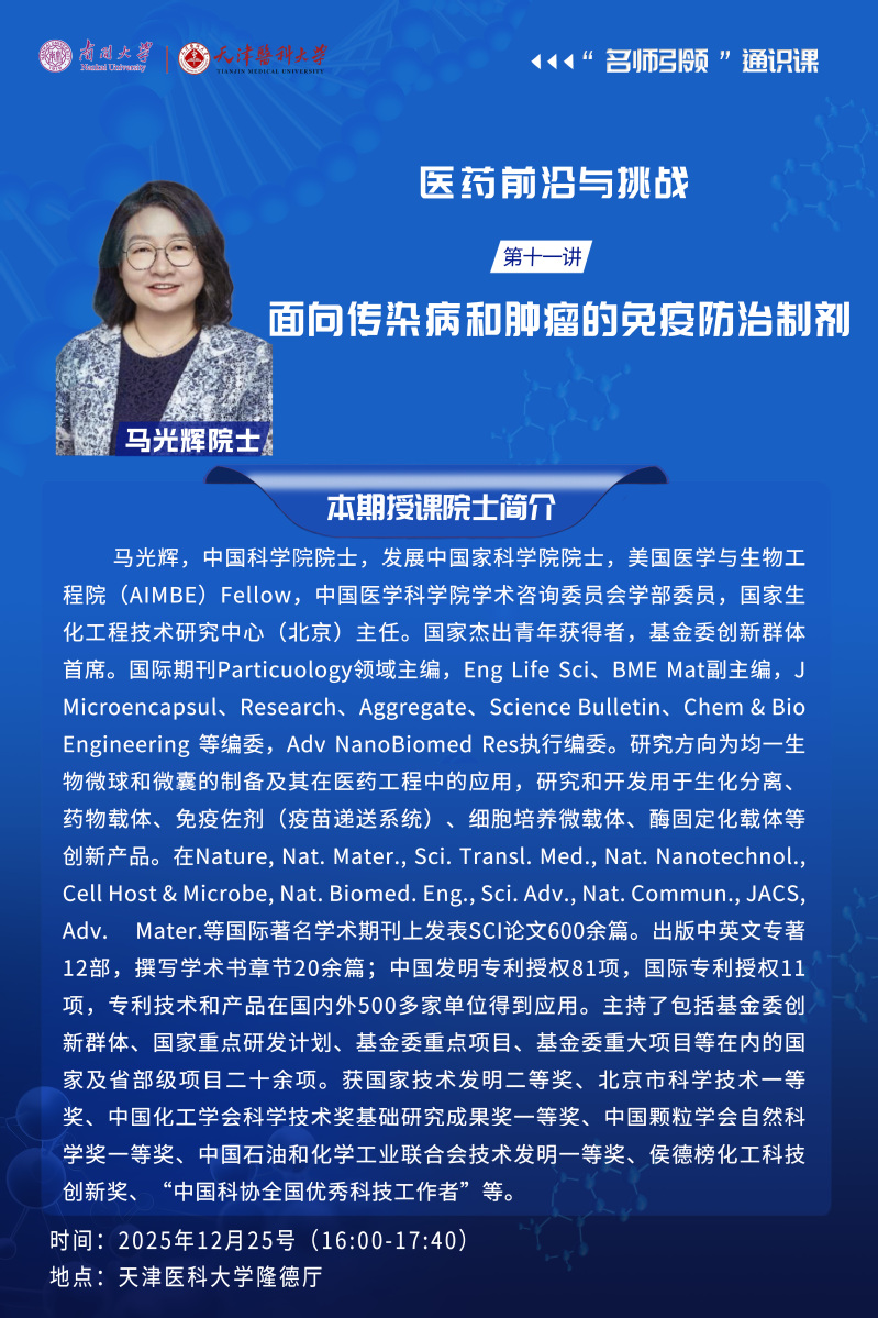 新一季“名师引领”系列通识课——《医药前沿与挑战》,将于10月9日正式开讲!该课程由曹雪涛院士领衔,自2021年启动以来,已成功举办四届,今年迎来第五季的精彩延续。本季课程由南开大学与天津医科大学联合打造,特邀侯凡凡院士等12位医药领域的两院院士联袂授课,面向全校本科生开放。课程紧密围绕“健康中国2030”战略,聚焦医药领域的关键议题,内容涵盖心血管疾病、糖尿病、肾病、肿瘤学、骨创伤学等临床医学热点,并延伸至再生医学、药物研发创新、中医中药、医工交叉等前沿方向。通过系统讲授,引导青年学子深入理解全球医药领域在临床实践、基础研究、成果转化及多学科融合中所面临的机遇与挑战。授课时间:10月9日起,每周四第9-10节课(16:00–17:40)授课地点:南开大学省身楼二楼报告厅/天津医科大学隆德厅欢迎同学们踊跃参与,与院士名家共探医药未来!